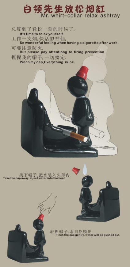 这么有创意的烟灰缸没见过吧?外形幽默奇趣,功能实用!一般的烟灰缸没有灭火装置,烟蒂扔进去会有大量的烟雾冒出来。 使用新奇时尚烟缸,只需拔去小红帽,在注水口装满水,套上帽子。需要灭火时,捏一下小红帽,就有少量的水注入池子,灌满水可以灭火几十次。每次抽完烟,往池子里一扔,然后捏一下小红帽,烟雾立消, 既实用又好玩。
